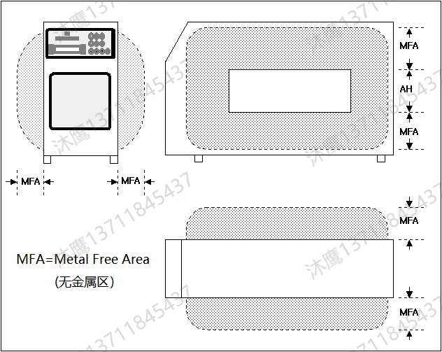 金屬探測器的電磁信號場一般位于探測頭隔離或防護好的內部,但是電磁信號會有一定的發散性,所以在檢測通道兩側會存在一個“無金屬區”。通常當金屬探測器頻率為低頻小于200KHz時,“無金屬區”約等于檢測通道高度的尺寸;當金屬探測器頻率為高頻時,“無金屬區”約等于檢測通道高度的1.5倍。該區域不允許存在金屬。
