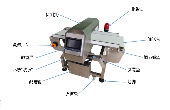 金屬探測儀是使用電磁場來檢查在傳送帶流水線上傳送的被檢查品,當探測出設定值以上的金屬信號時,輸出金屬混入的警報或輸出由選擇器發出的剔除指令信號的裝置。