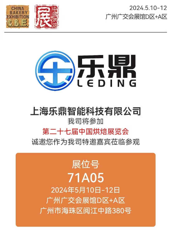 上海樂(lè)鼎智能科技有限公司/東莞市沐鷹智能科技有限公司于2024.05.10日在廣州廣交會(huì)展館D區(qū)參加第27屆中國(guó)烘焙展覽會(huì),展位號(hào):71A05, 歡迎新老客戶過(guò)來(lái)現(xiàn)場(chǎng)參觀和指導(dǎo)!