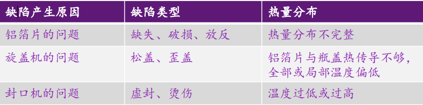 鋁箔片被電磁加熱之后,一方面融化熱封膜完成封口,另一方面通過熱傳導將熱量傳遞到瓶蓋,此時可以通過紅外熱成像相機捕捉到瓶蓋表面的熱量分布。此熱量分布直接反映的是墊片與瓶蓋的壓緊程度,而壓緊程度間接地反映出封口質(zhì)量。當有封口缺陷產(chǎn)生時,熱量分布會出現(xiàn)異常,其對應(yīng)關(guān)系如下: